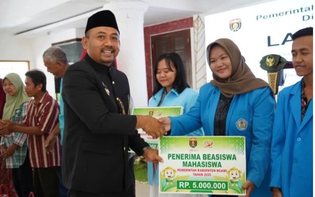 NGAWI MAKNAJATIM – Bupati Ngawi, Ony Anwar Harsono, secara simbolis menyerahkan Bantuan Langsung Tunai Dana Bagi Hasil Cukai Hasil Tembakau (BLT-DBHCHT) Tahap 2 dan beasiswa di Pendopo Wedya Graha Ngawi, Senin (13/10/2025).
