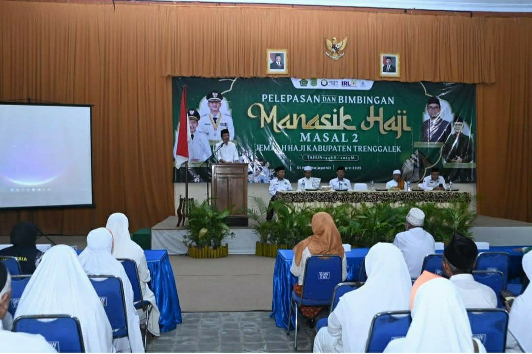 TRENGGALEK MAKNAJATIM – Bertempat di Hall Majapahit Hotel Hayam Wuruk, Jamaah Calon Haji (JCH) Kabupaten Trenggalek tahun 2025, dilepas Wakil Bupati Trenggalek, Syah Mohamad Natanegara, bersamaan dengan bimbingan manasik haji masal 2 ,Senin 21/4/2025.