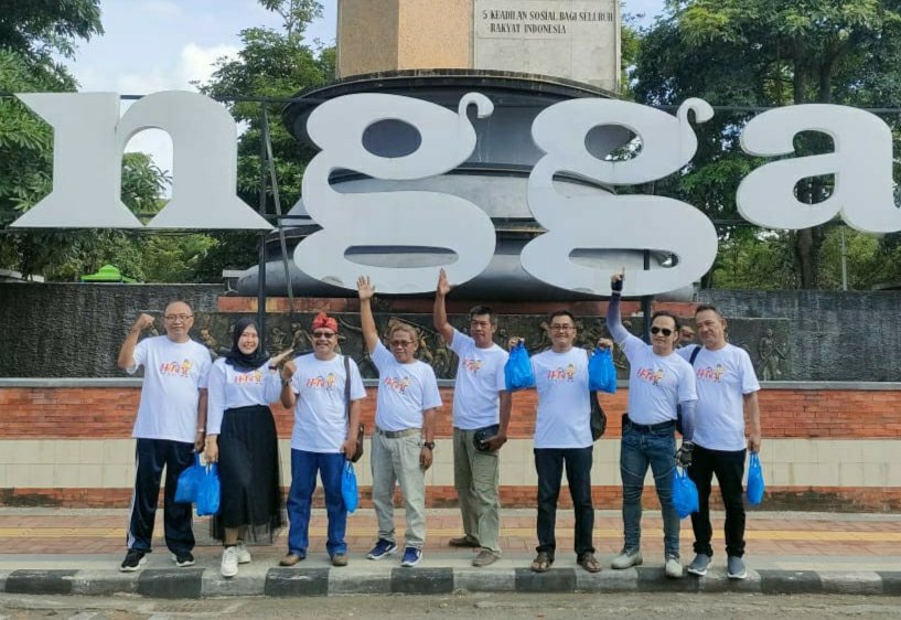 Foto : Lendra / Pengurus PWI Kabupaten Trenggalek bagi bagi bingkisan di Tugu Pancasila.