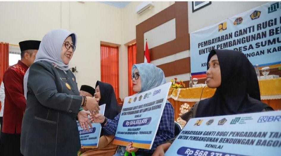 Trenggalek,Maknajatim – , Penjabat Sementara (Pjs.) Bupati Trenggalek, Dyah Wahyu Ermawati menyerahkan secara simbolis uang ganti rugi untuk 39 warga terdampak Pembangunan Proyek Strategis Nasional (PSN) Bendungan Dam Bagong, bertempat di Aula Dinas PUPR kabupaten Trenggalek Rabu (16/10/2024).